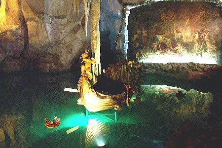 Inside the grotto--Ludwig's boat, which he liked to sit in while his servants rowed him around lake. The mural depicts a scene from one of Ludwig's favorite operas.